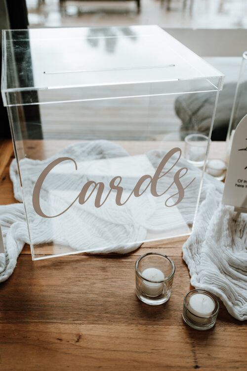 This modern acrylic clear cube wishing well has a lid with a slit in the top for cards.